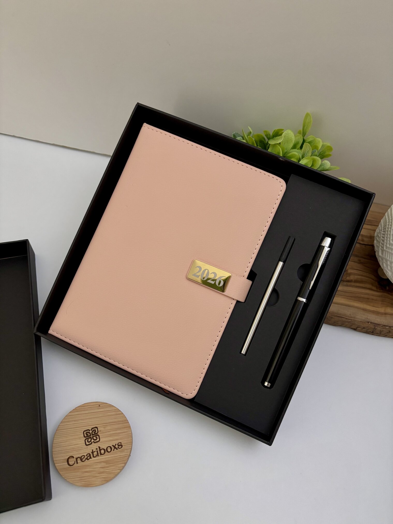 Un Set agenda rosa personalizado con broche rectángulo dorado y bolígrafo en caja en un elegante estuche de regalo negro, expuesto junto a un posavasos de madera Creatiboxs y una planta verde.