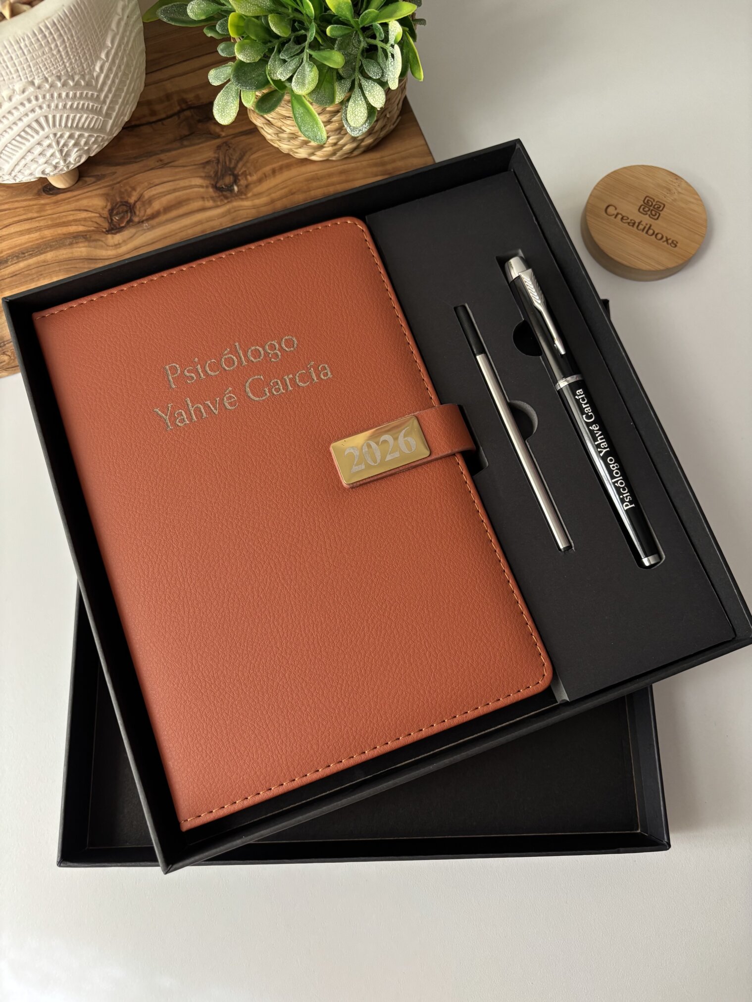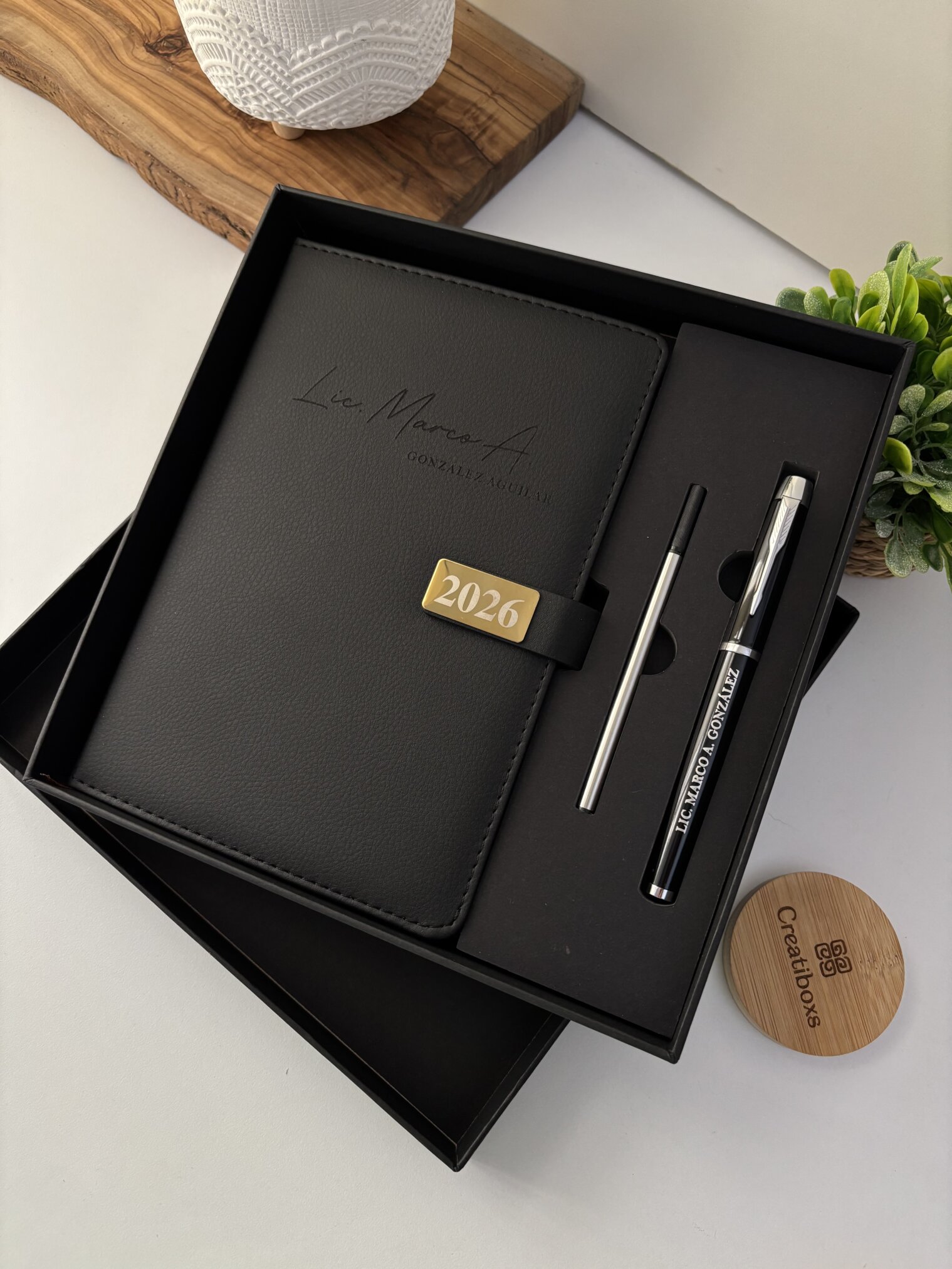 Set agenda personalizada con broche rectángulo dorado y bolígrafo en caja, color negro 2026, acompañado de un lápiz. Presentado junto a una planta y un portavasos de madera.