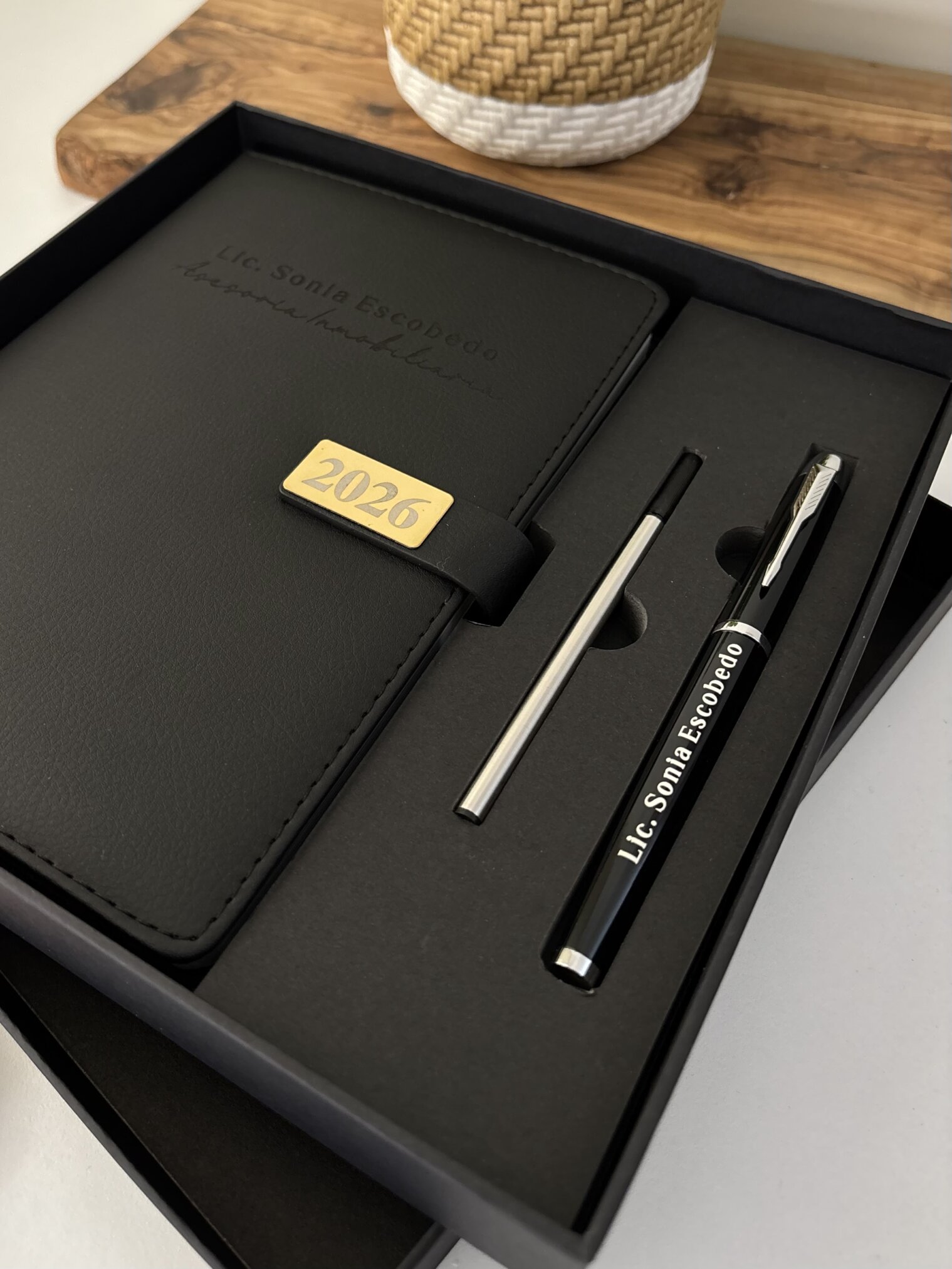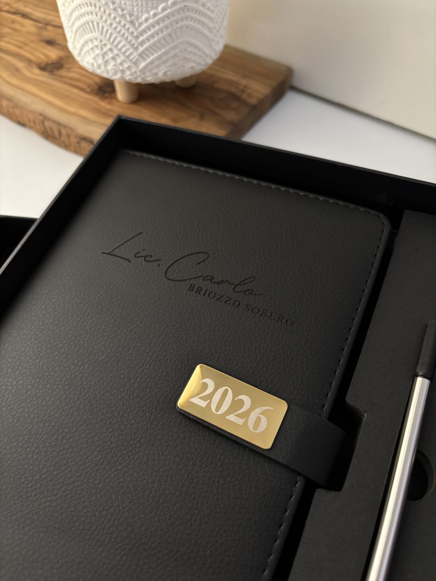 Set agenda personalizada negra 2026 con broche rectángulo dorado y tu nombre, acompañado de bolígrafo en caja, junto a un elegante florero decorativo.
