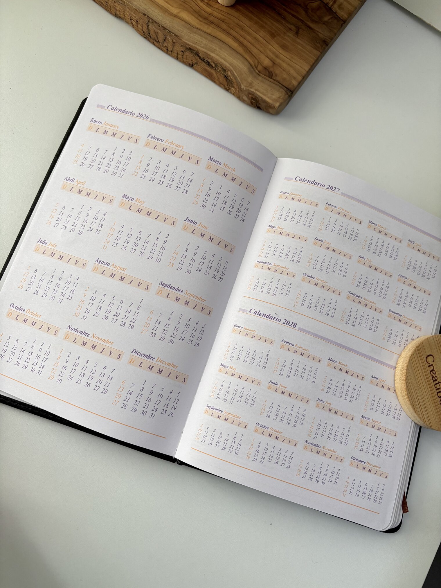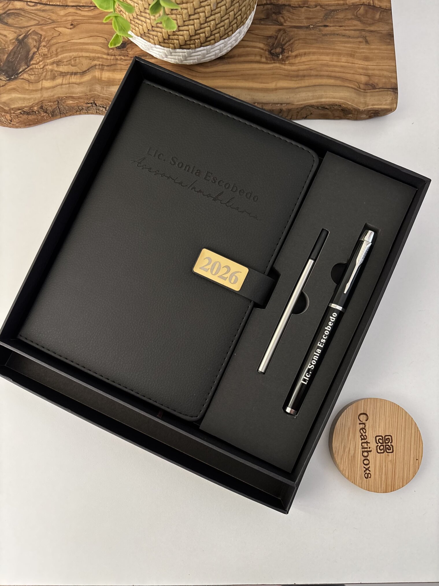 A Set agenda personalizada con broche rectángulo dorado y bolígrafo en caja, con páginas fechadas y listón marrón, se muestra junto a un portavasos redondo de bambú CreatiBoxs.